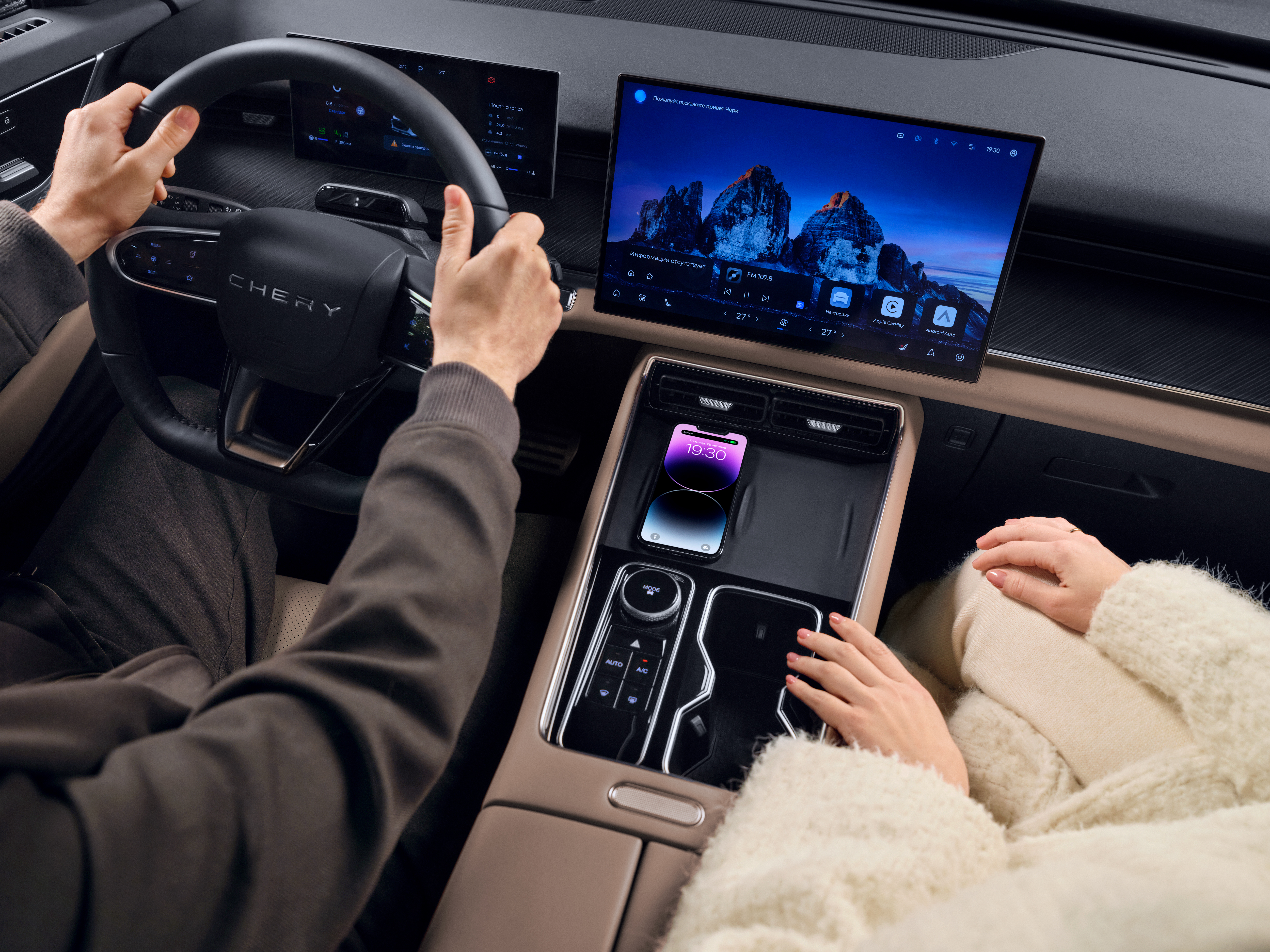 Цифровая приборная панель диагональю 10,3 дюйма и мультимедийный экран 15,6 дюйма с разрешением 2,5K создают современное информационное пространство. Интерфейс поддерживает Apple CarPlay, Android Auto и голосовое управление.