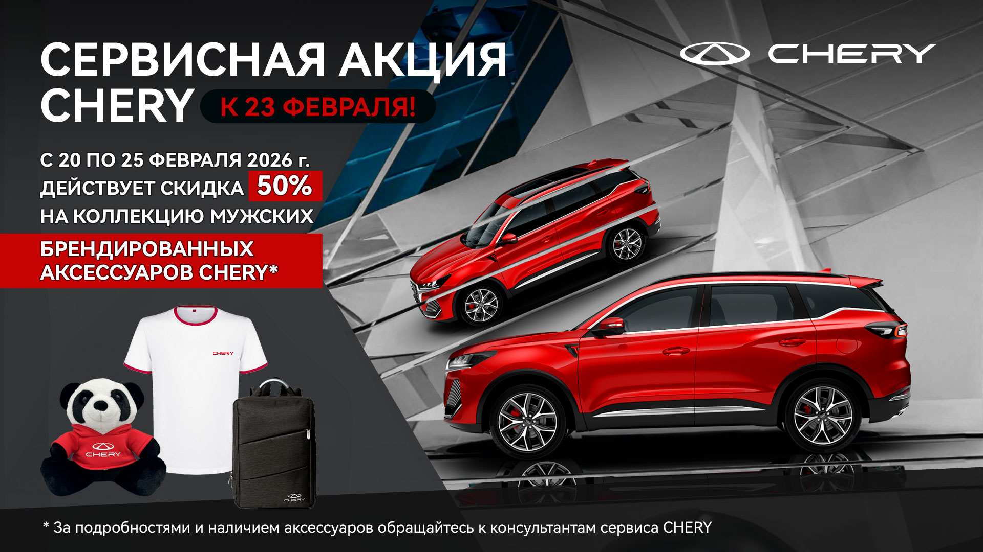 В «АВТО ДЛЯ ВАС» с 20.02. по 28.02. 2026 г. действует скидка 50% на коллекцию МУЖСКИХ БРЕНДИРОВАННЫХ АКСЕССУАРОВ CHERY. * Все подробности уточняйте у сервисных консультантов.